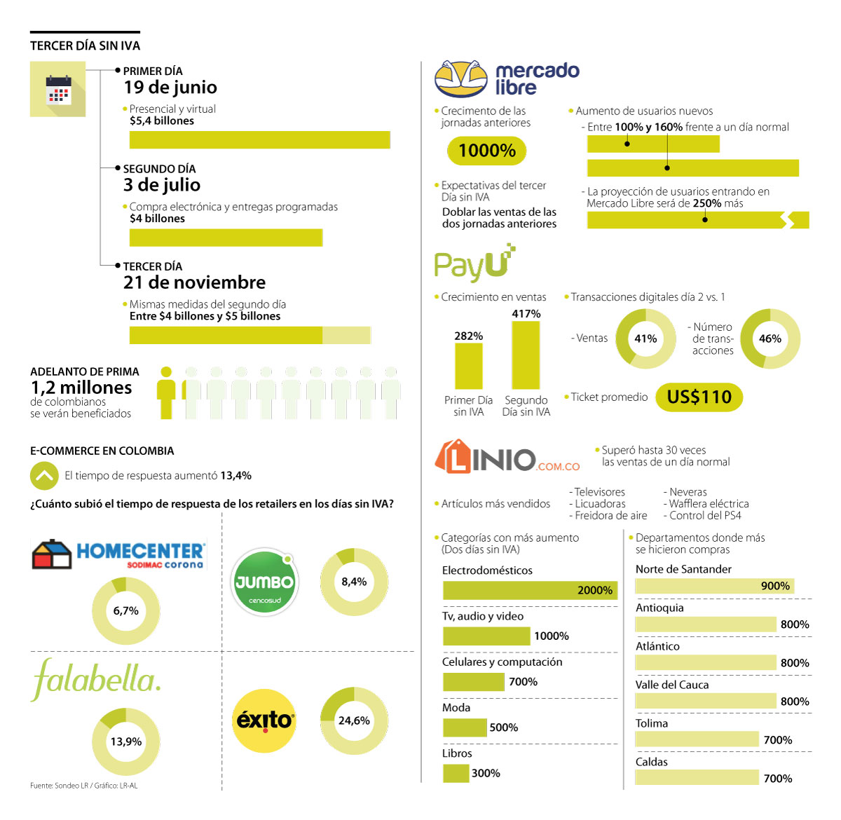 De acuerdo con PayU, las ventas a través de la pasarela tuvieron un crecimiento de 282% en comparación con un día de venta promedio en el primer Día sin IVA y en la segunda jornada el alza fue de 417%. Las ventas y el número de transacciones digitales de la última fecha registraron un crecimiento de 41% (US$86 millones) y 46% (760.000 transacciones aprobadas), respectivamente, en comparación con la primera jornada (ventas por US$61 millones y 520.000 transacciones). El ticket promedio estuvo sobre US$110.