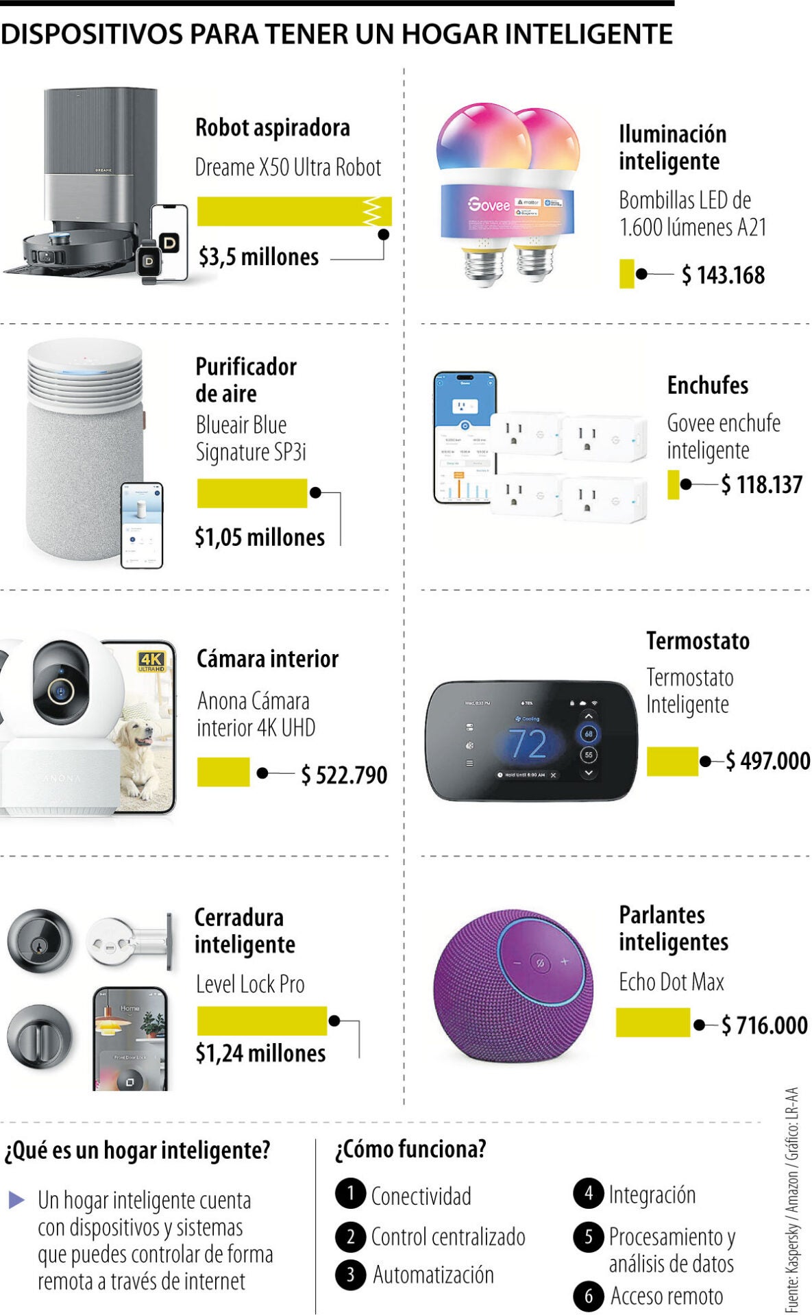 Un hogar inteligente tiene dispositivos y sistemas que pueden ser controlados de forma remota, según explica Kaspersky. Además, los dispositivos tienen la ventaja de interactuar entre sí y con el usuario, los cuales, por lo general, están conectados a una aplicación en el celular. Un robot aspiradora, purificador de aire, cámaras interiores y una serie de elementos inteligentes como iluminación, parlantes y cerraduras pueden modernizar el hogar, con un costo estimado de más de $7 millones.