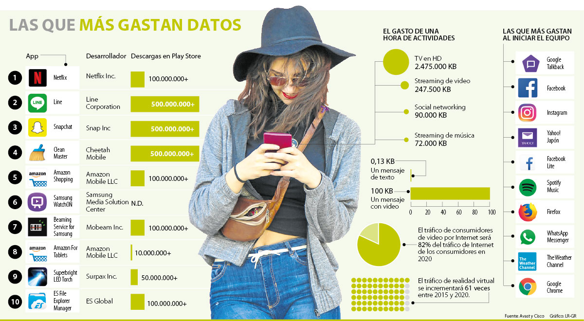 Trimestralmente, la compañía especializada en el sector, Avast, emite un informe en el que revela cuáles son las apps que están generando mayor uso de datos. La última actualización del estudio, correspondiente al tercer trimestre, reveló que de las aplicaciones abiertas por los usuarios, Netflix, Line y Snapchat son las herramientas que más generan consumo de datos.