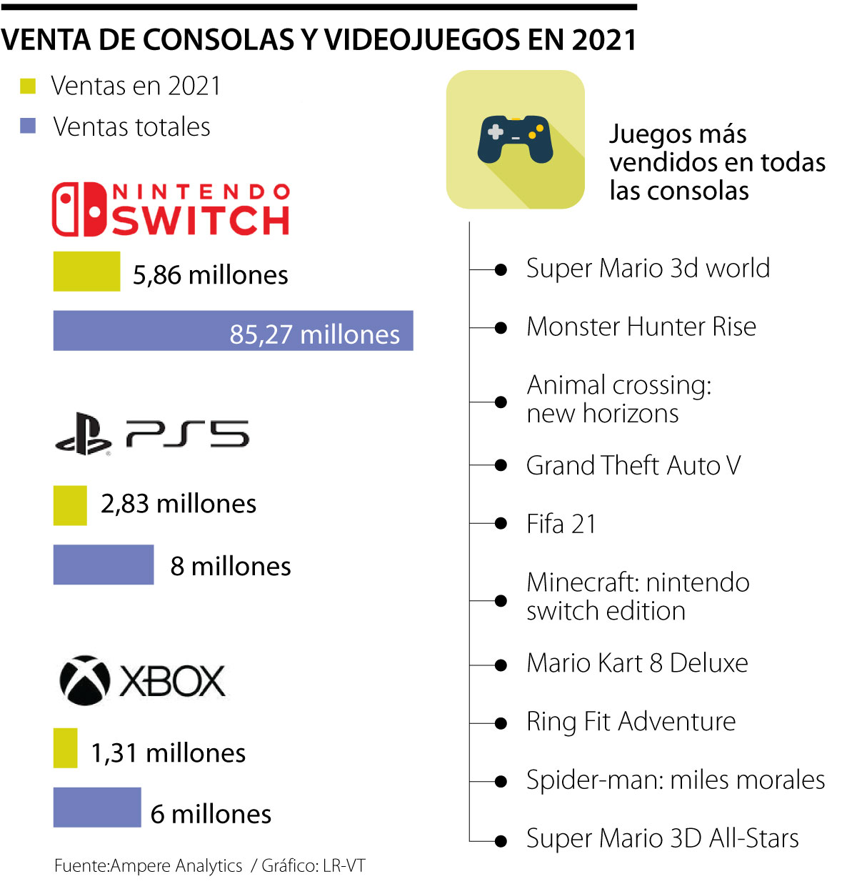 En lo que respecta a todo el mercado, los más vendidos son Super Mario 3D (Switch); Monster Hunter Rise (Switch); Animal Crossing: New Horizons (switch); Grand Theft Auto V (PS4); Fifa 21 (PS4); Minecraft: Nintendo Switch Edition (Switch); Mario Kart 8 Deluxe (Switch); Ring Fit Adventure (Switch); Spider-man: iles morales (PS5).