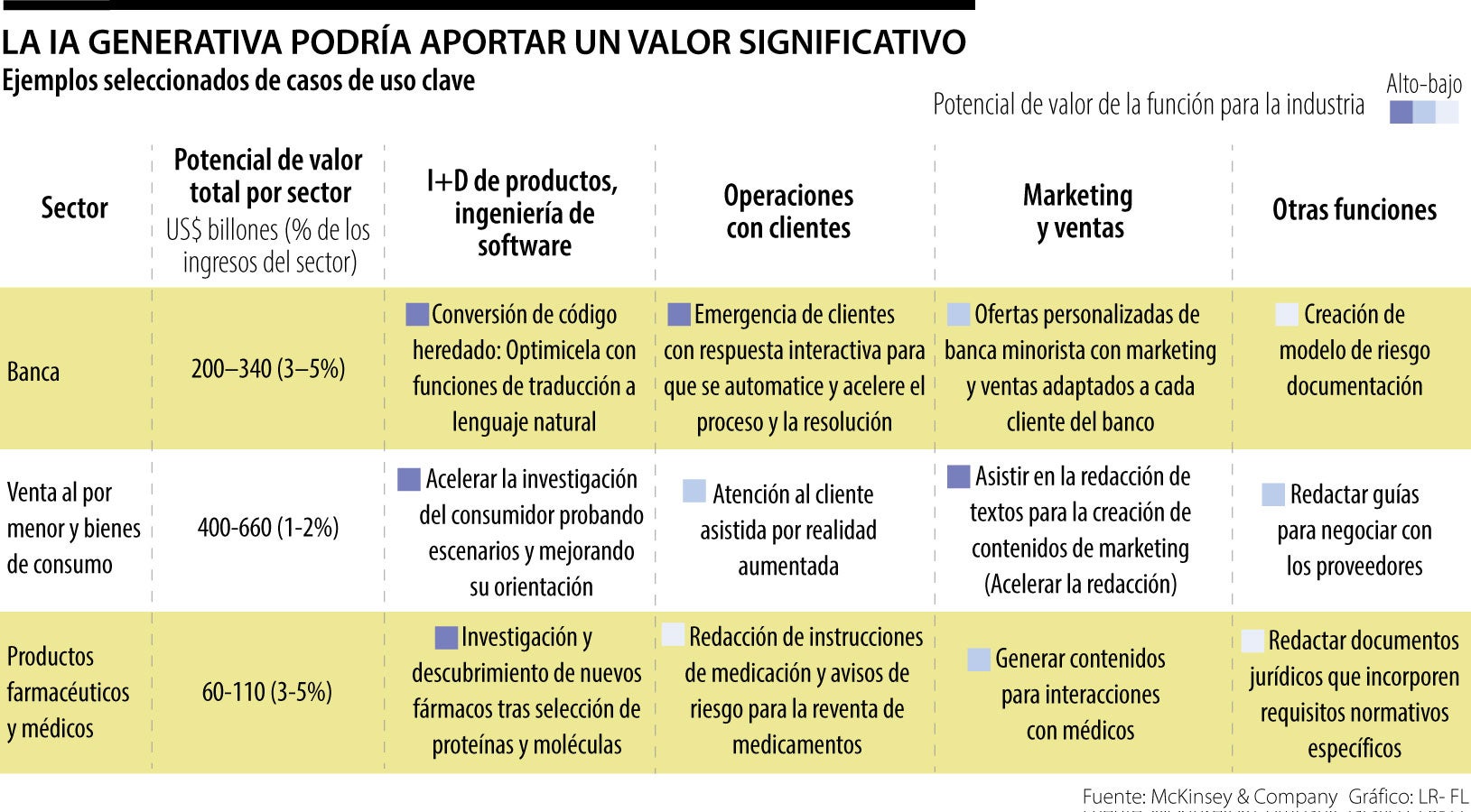 "Nuestro análisis encuentra que la IA generativa podría tener un impacto significativo en las industrias farmacéutica y de productos médicos, de US$60.000 millones a US$110.000 millones anuales", destacó el reporte.