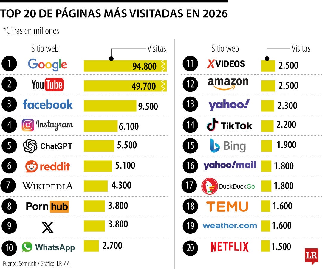Semrush reveló el ranking de las 20 plataformas que más movieron tráfico durante enero, el cual resaltó que ChatGPT ya ocupa el quinto lugar