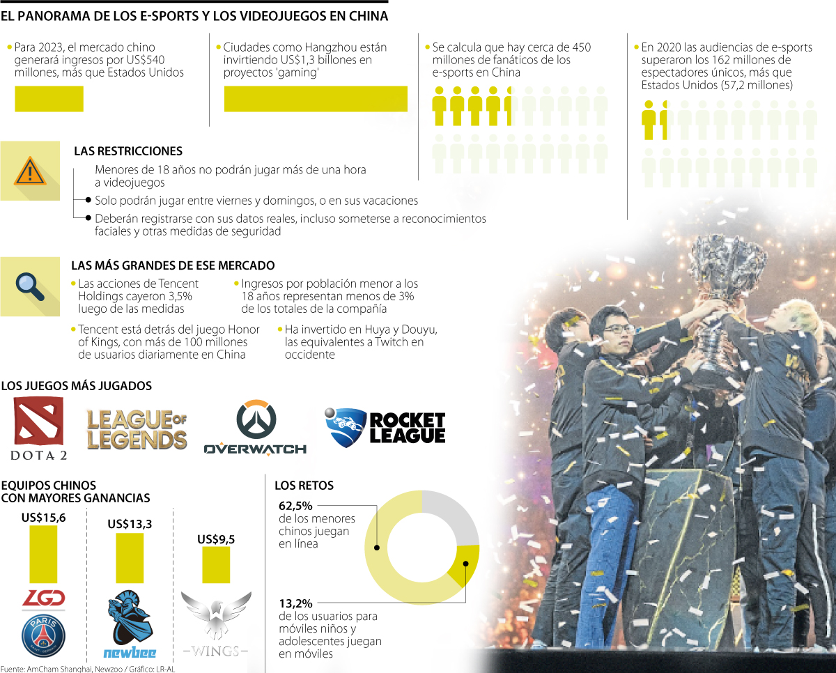 Según el portal especializado E-sports Flag, videojuegos en línea como League of Legends, de Tencent, Overwatch, Dota 2 y Rocket League son los más jugados por los jóvenes en China. Asimismo, información de la analítica Newzoo estimó que el mercado de este sector en ese país movió más de US$385,1 millones el año pasado, y proyecta que para 2023 alcanzar US$540 millones, generando más de dos millones de empleos formales, aún a pesar de las nuevas restricciones.