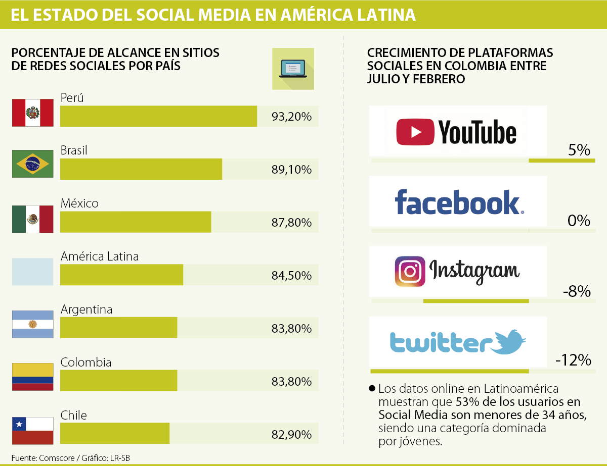 Recientemente la organización de investigación de mercadeo por internet, ComScore, realizó una actualización de su informe sobre el estado del social media, entendido como el sector que comprende redes sociales, blogs y demás espacios de interacción digital en América Latina, en el que se descubrió que el alcance de estos sitios entre usuarios colombianos es de 83,8%, estadística que para el promedio de la región se estableció en 84,5%.