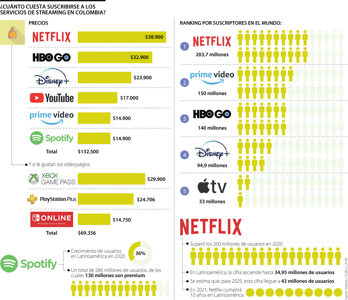 En Colombia, contar en casa con todas estas plataformas de streaming puede costarle hasta $132.500 mensuales, en caso de estar suscrito a los servicios de Netflix, Amazon Prime, Disney +, HBO GO, Spotify y Youtube. Ver sus películas favoritas y escuchar su música preferida puede acarrear costos superiores a $1.590.000 anuales, valor que cada se vez se va asentando en los gastos de los hogares colombianos.