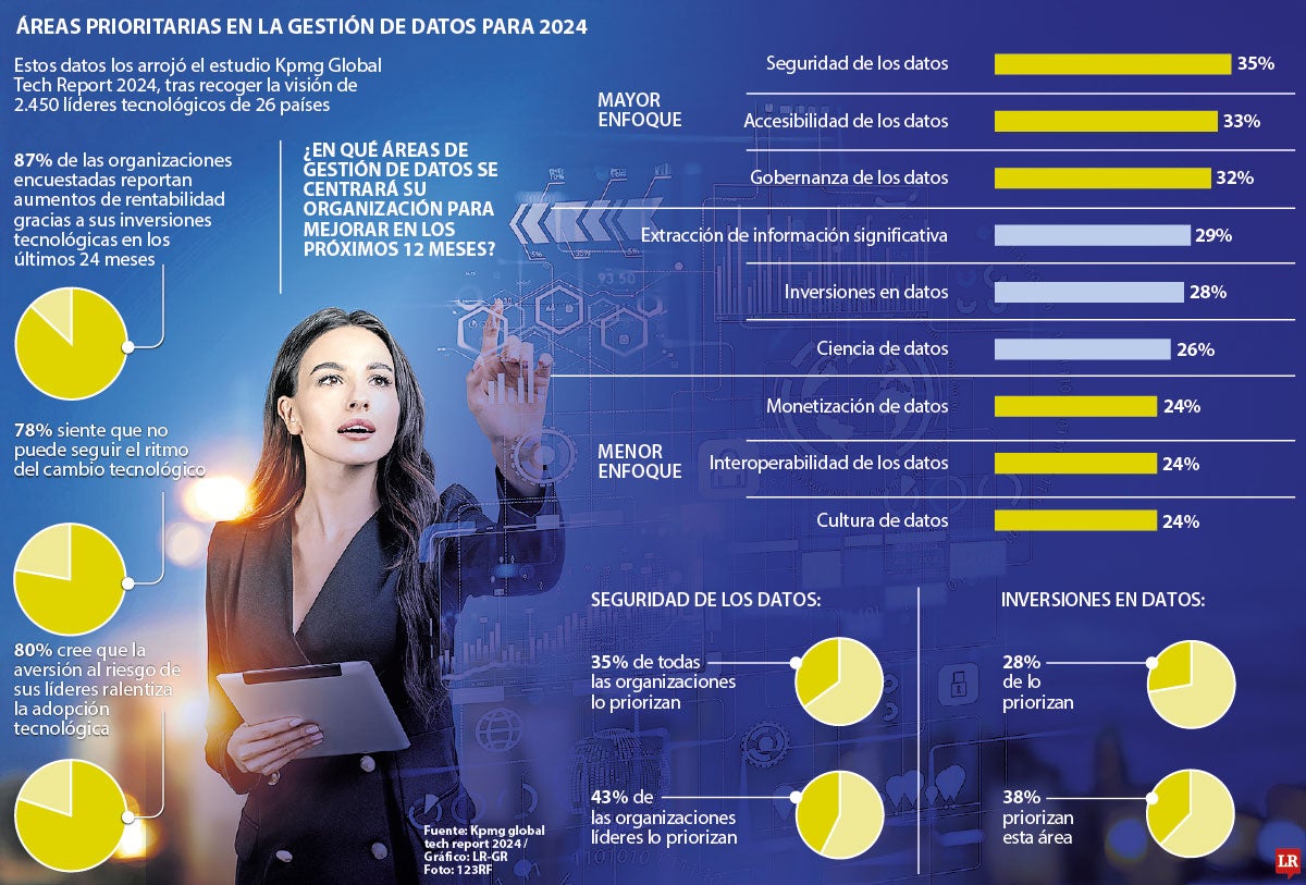En un contexto donde la inteligencia artificial, la automatización y el cloud computing dominan los titulares, un aspecto mucho más estructural está ocupando silenciosamente los primeros lugares en las prioridades tecnológicas: la seguridad, gobernanza y accesibilidad de los datos. Así lo revela el Kpmg Global Tech Report 2024, un estudio que recoge la visión de 2.450 líderes tecnológicos de 26 países alrededor del mundo.