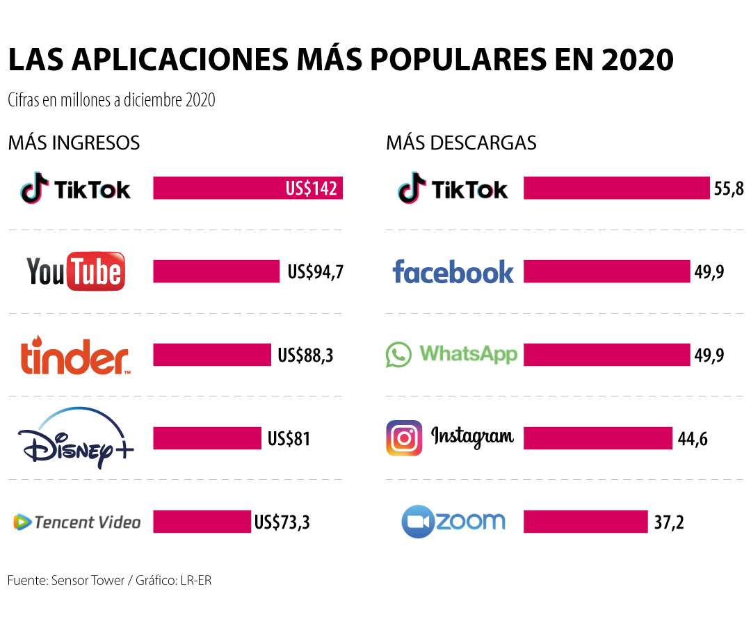 Sin embargo, en esa inmensa oferta hay algunas apps más populares que otras. Según cifras de Sensor Tower, para diciembre de 2020, las aplicaciones que cerraron el año con el mayor número de descargas fueron Tik Tok, con 55,8 millones; y Facebook y Whatsapp, con 49,9 millones.