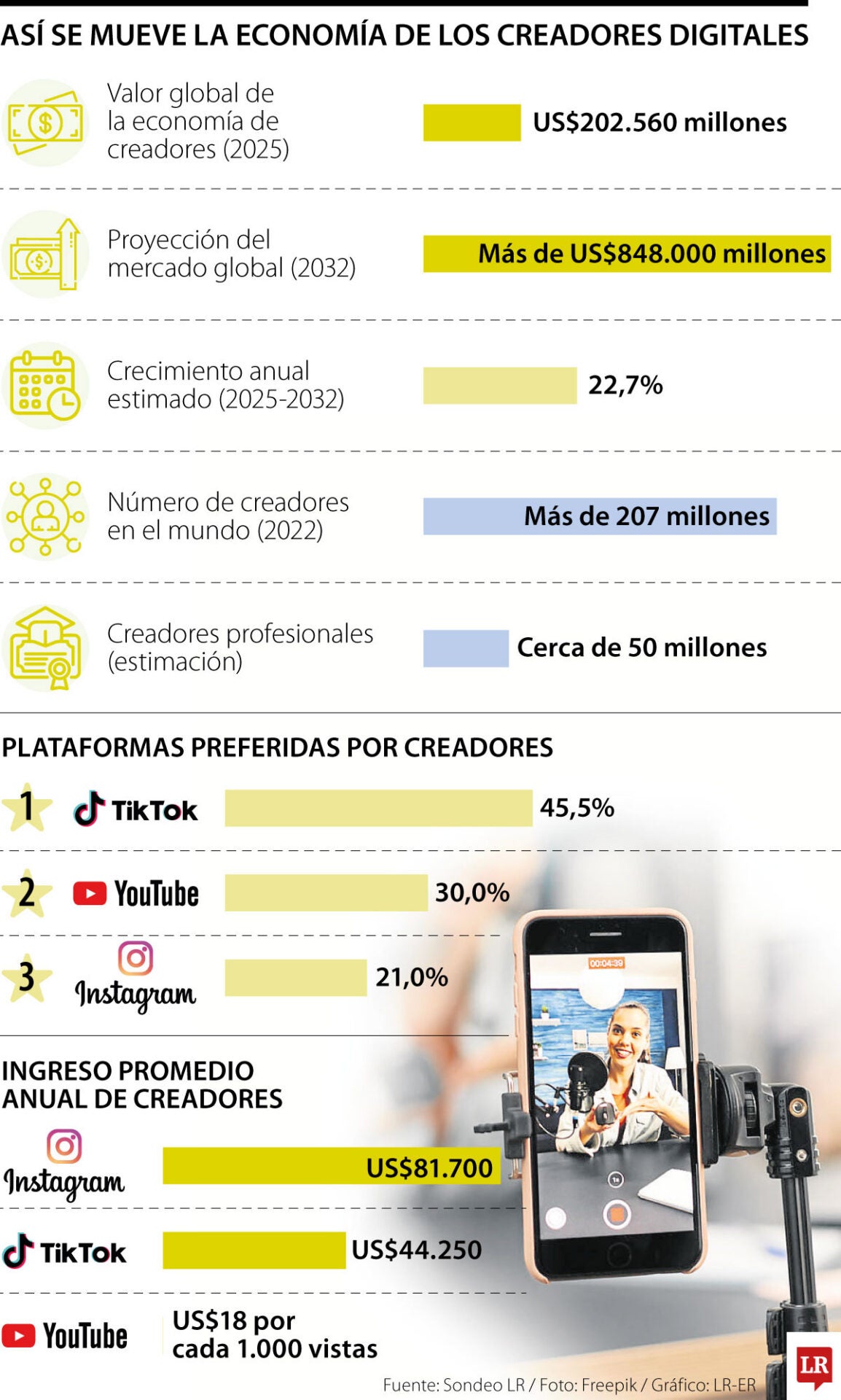 Según distintos estudios del sector, el mercado global de la creator economy alcanzó un valor aproximado de US$202.560 millones en 2025 y podría superar los US$848.000 millones para 2032, con una tasa de crecimiento anual cercana a 22,7%. Este crecimiento está impulsado por el aumento del número de creadores, que ya supera los 200 millones en el mundo, y por el papel cada vez más relevante que juegan las plataformas digitales en la conexión entre audiencias, marcas y contenido.