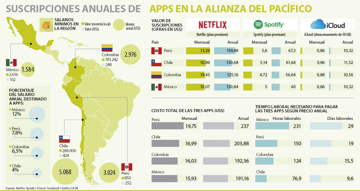 Teniendo en cuenta que un colombiano gana alrededor de US$2.976 al año con un salario mínimo mensual, el monto destinado a financiar una suscripción anual a estas tres aplicaciones comprende 6,5%. En los demás países, la suma destinada al pago de Netflix, Spotify y iCloud llega a 12% de la paga anual desde los ingresos básicos en México, mientras que en Perú alcanza 7,8% y en Chile solo acapara 4% de esa cantidad.