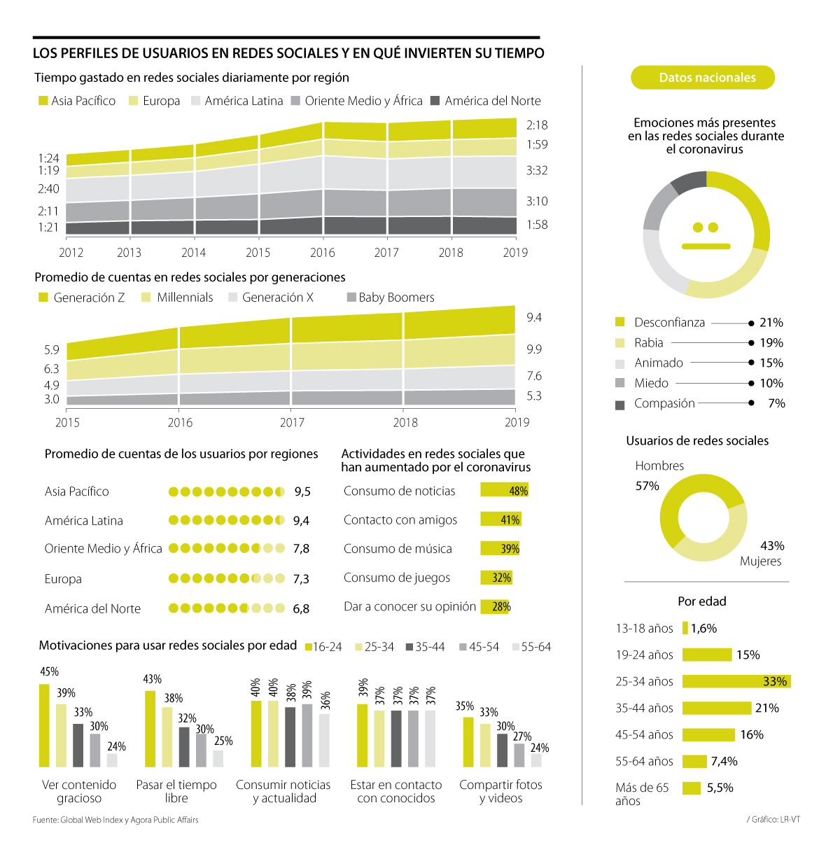 Un informe de la firma Global Web Index dio a conocer detalles sobre el uso de las redes sociales como el número promedio de cuentas que tienen las personas en las diferentes regiones del mundo. La lista la encabezan los usuarios de Asia y el Pacífico, con un promedio de 9,5 cuentas por persona; seguido de cerca por Latam con 9,4; Oriente Medio y África tienen 7,8; 7,3 cuentas hay en Europa y 6,8 en Norte América.