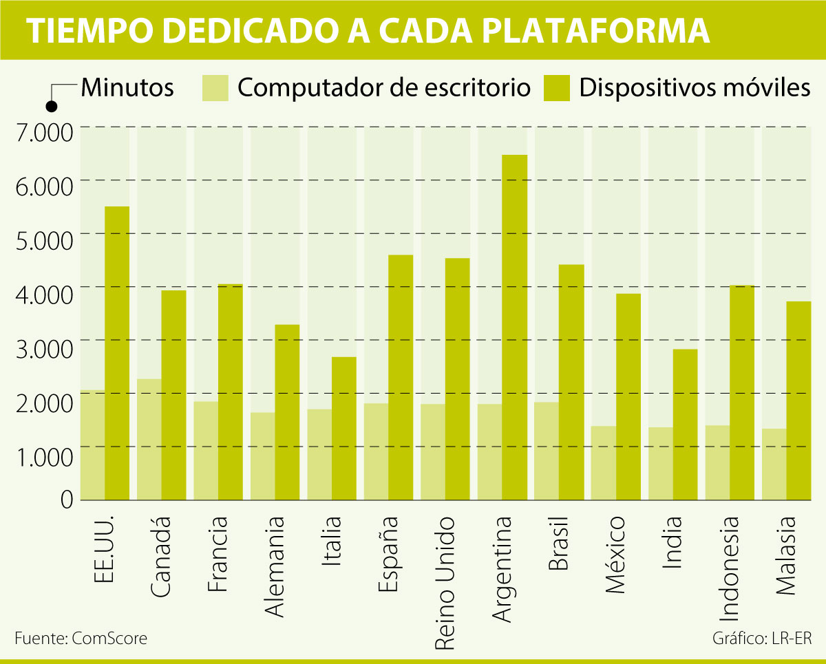 Hace tiempo, que los smartphones tomaron la delantera en la cantidad de horas consumidas por los usuarios. Tanto que en la actualidad, cada persona pasa el doble de minutos desde sus celulares que desde las computadoras de escritorio. Y en países como Argentina esta cifra se llega a triplicar pues mientras un usuario de computador está 2.000 minutos en la plataforma, el de móvil dedica más de 6.000 minutos.