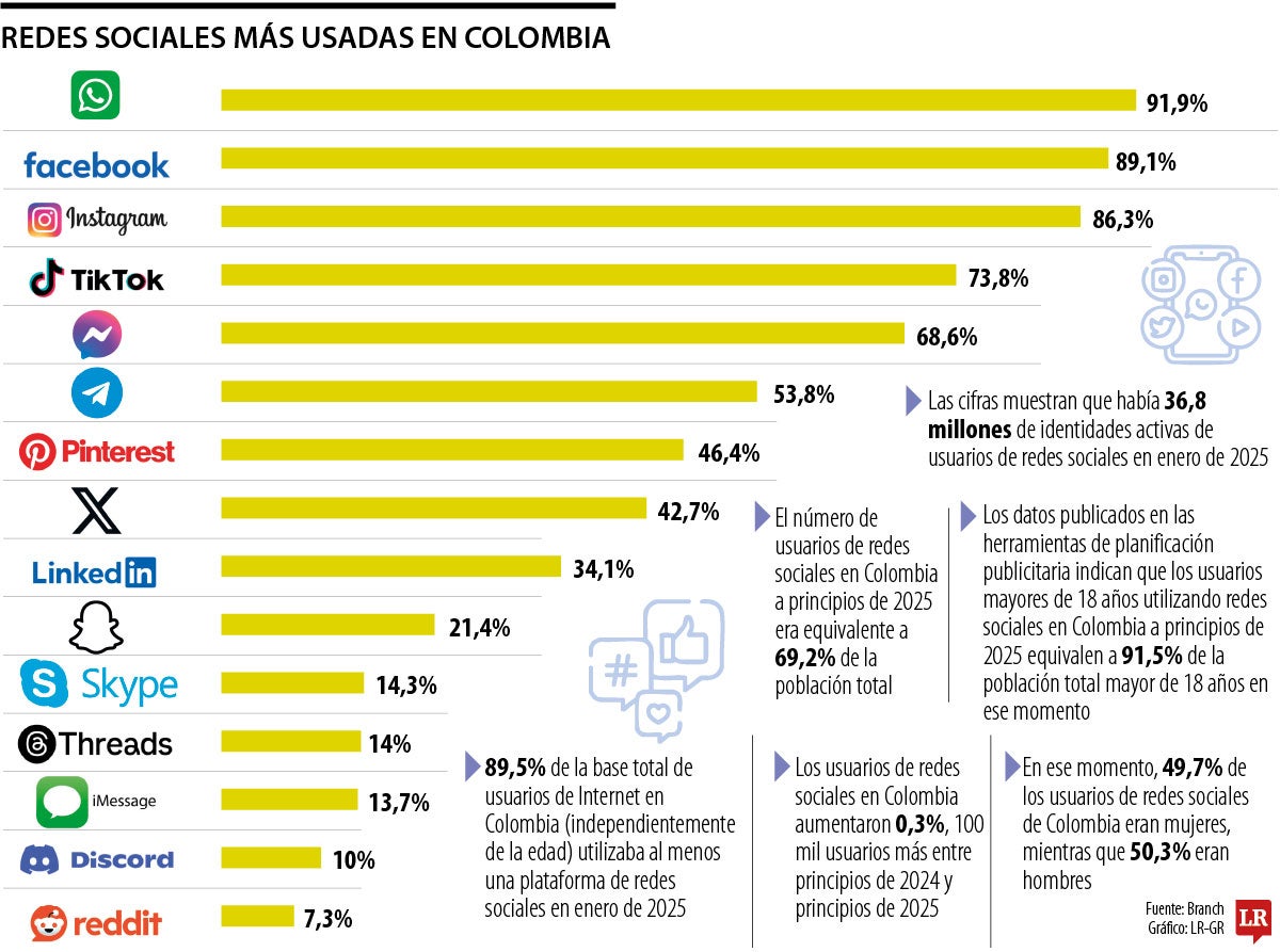 “Los datos publicados en las herramientas de planificación publicitaria indican que los usuarios mayores de 18 años utilizando redes sociales en Colombia a principios de 2025 equivalen al 91,5 % de la población total mayor de 18 años en ese momento”, afirmó el estudio de la empresa.
