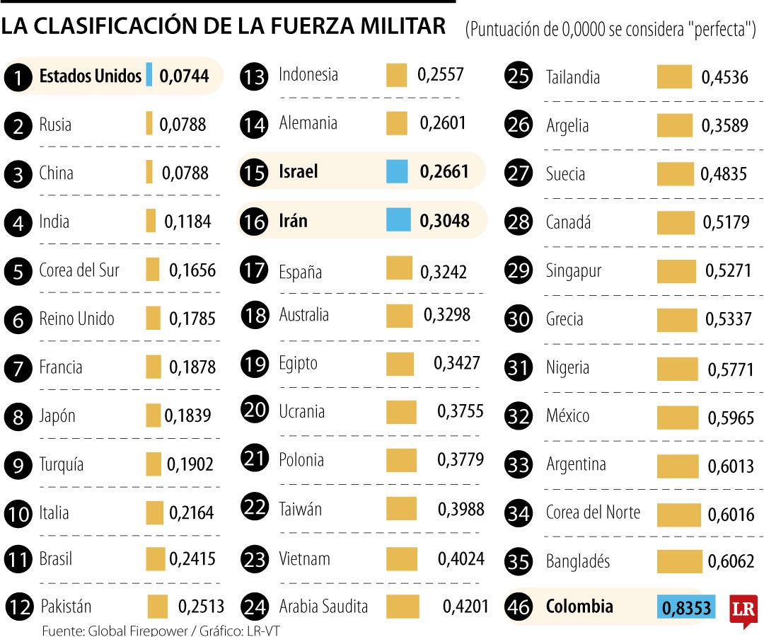 Israel e Irán están juntos en el ranking de Global Firepower 2025, al ocupar el puesto 15 y 16; Colombia está en el lugar 46 del listado
