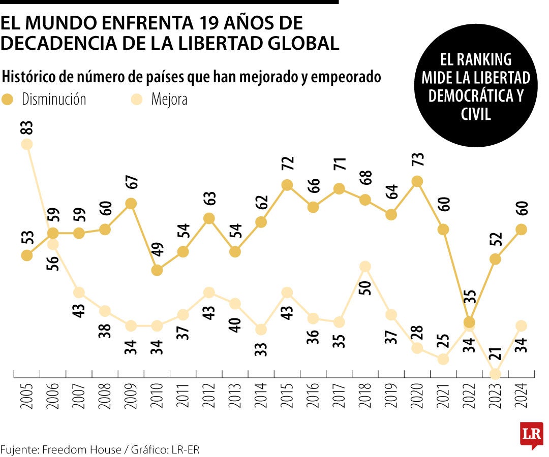 El mundo ha vivido una decadencia de 19 años en materia de libertad; en 2024, 60 países desmejoraron en el índice mientras 34 mejoraron