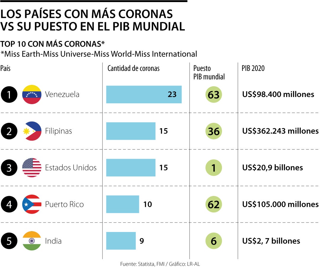 Miss Universe es el único ranking que agrupa en el podio a países ricos y pobres. Estados Unidos, Venezuela y Puerto Rico lideran el podio