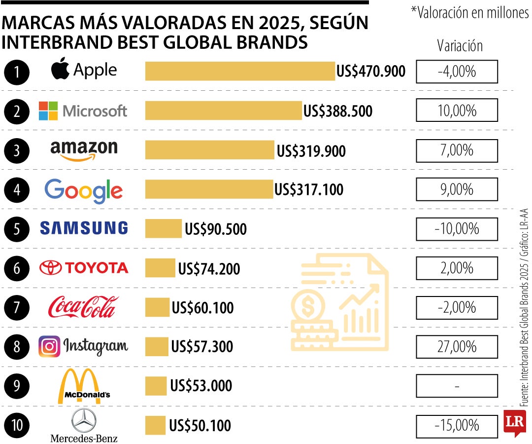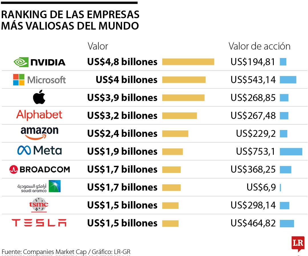 Las dos siguientes compañías más grandes son Microsoft y Apple, con una valoración de aproximadamente US$4 billones cada una