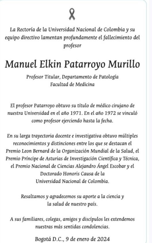 La Universidad, a través de un comunicado de la decana, destacó y agradeció el invaluable aporte de Manuel Elkin Patarroyo Murillo a la ciencia y a la salud del país, expresando además sus condolencias a su familia.