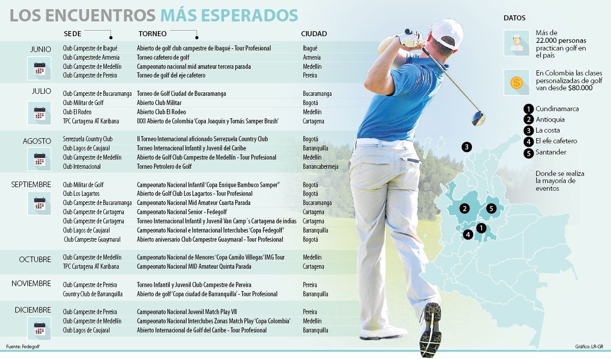 En el ámbito deportivo, entre junio y diciembre de este año Fedegolf programó más de 30 torneos. Cundinamarca, Antioquia, La costa, el efe cafetero y Santander son las regiones del país en las que mayor número de eventos albergarán, teniendo en cuenta la calidad certificada de los campos que allí se pueden encontrar.