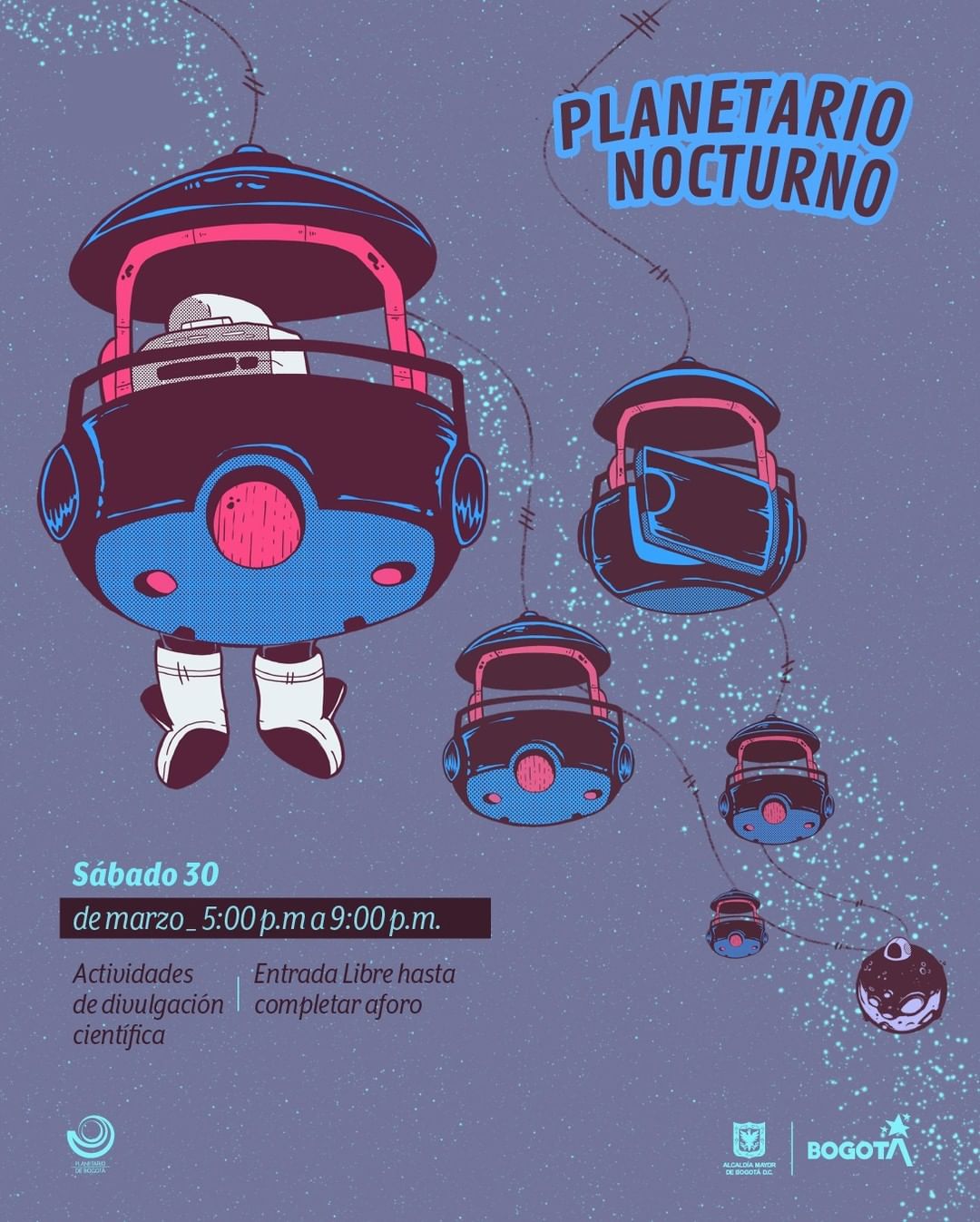 En medio del receso por la Semana Santa, el Planetario de Bogotá le invita este 30 de marzo al primer ‘Planetario Nocturno’. Habrá charlas controversiales sobre evolución de la humanidad, talleres interactivos que despiertan la curiosidad, observación por telescopio bajo el cielo urbano y se dará apertura a los nuevos talleres en el domo. Boletas en Tuboleta.com.