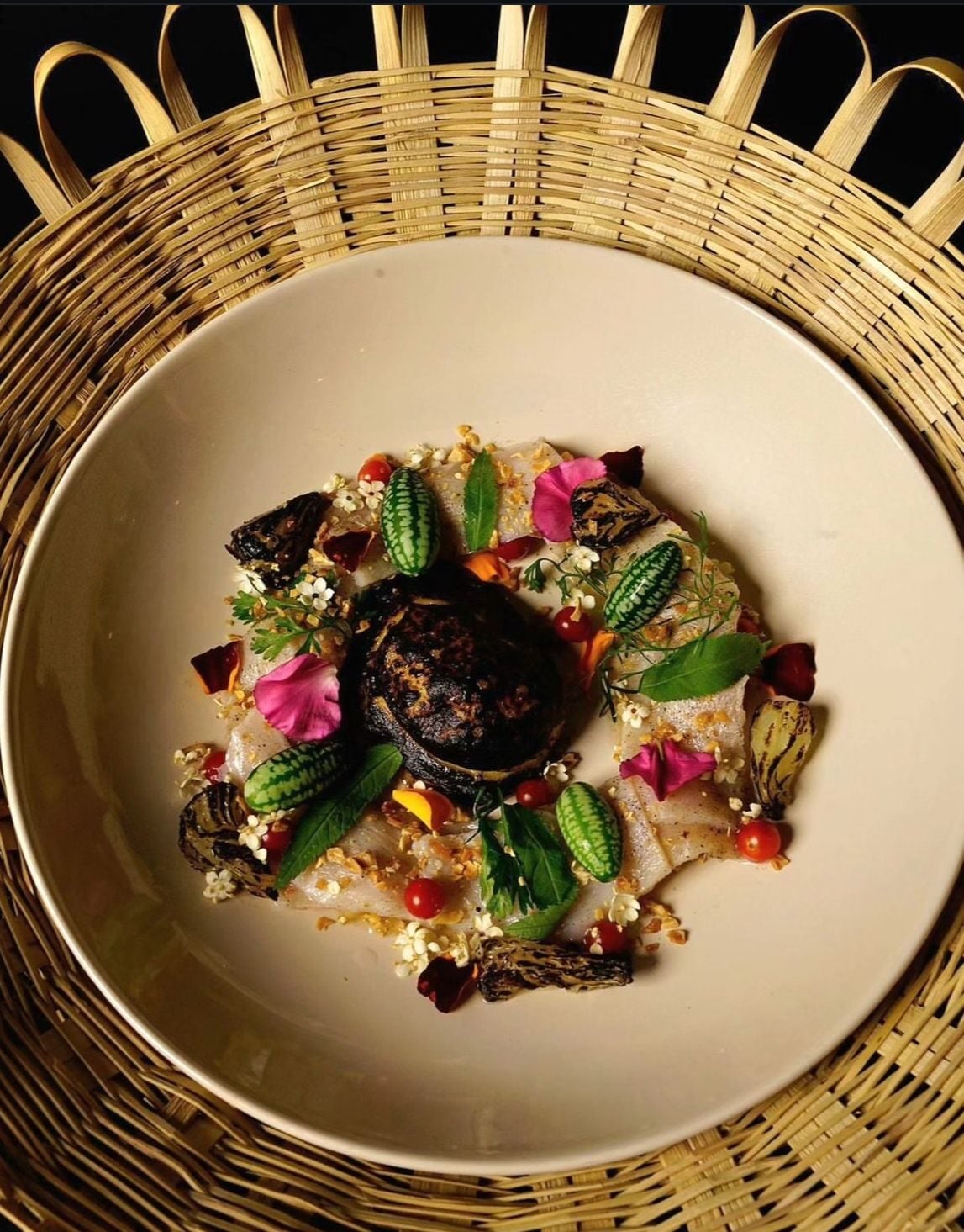 Este plato al centro de mesa, consta de un curado de pirarucú tomates perla, semillas de macambo, pomelo, cremoso de yuca, copoazú y aguaselva de pepinos y pimentones amazónicos con catara indígena.