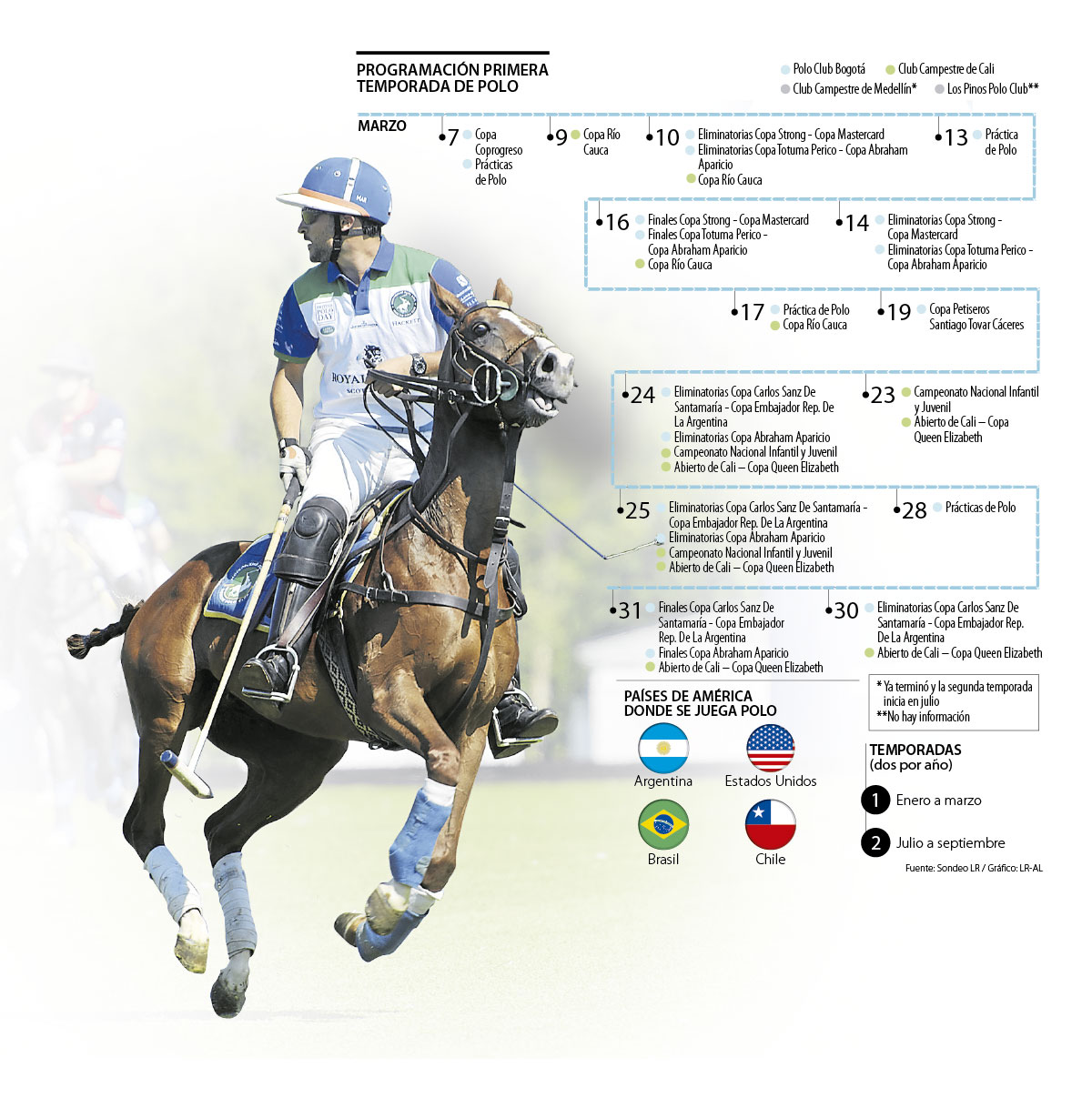 En el país se realizan dos temporadas al año, la primera entre enero y marzo, y la segunda se lleva a cabo entre julio y agosto. Por eso, LR le trae la agenda de los torneos que realizarán el Polo Club Bogotá, Los Pinos Polo Club, Club Campestre de Medellín y Club Campestre de Cali.
