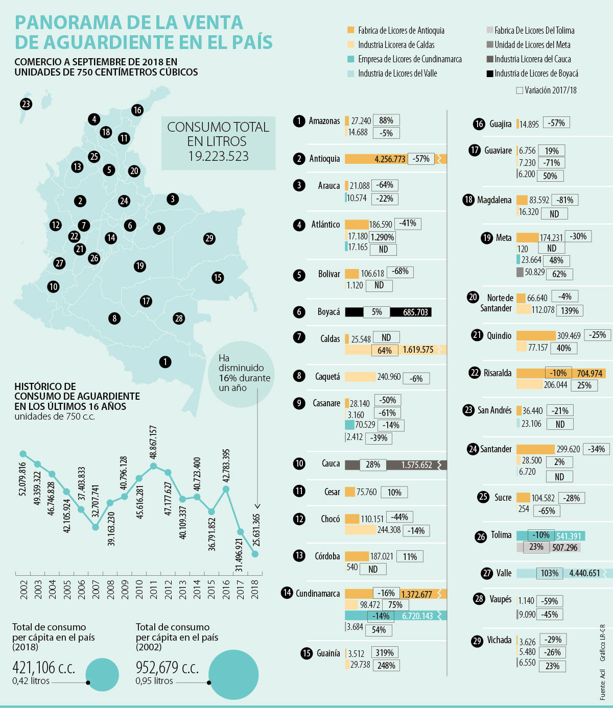Esta batalla no se ha sentido por igual en todas las licoreras de los departamentos. Por ejemplo, la Fábrica de Licores de Antioquia, registró 8,2 millones de botellas vendidas en un año con corte a septiembre de 2018, según Acil. Estas unidades fueron distribuidas en 23 departamentos en los que tiene presencia. Antioquia es su principal destino, con 4,2 millones de botellas. Sin embargo, este total de ventas muestran una caída de 45% con respecto al año anterior.