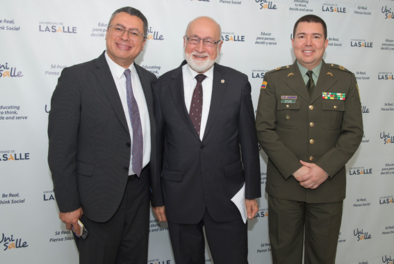 Elkin Sánchez, Decano de la Facultad de Ciencias de la Salud; Hno. Alberto Prada Sanmiguel, Rector de la institución y Coronel Dave Figueroa, Director de Prevención Policía Nacional