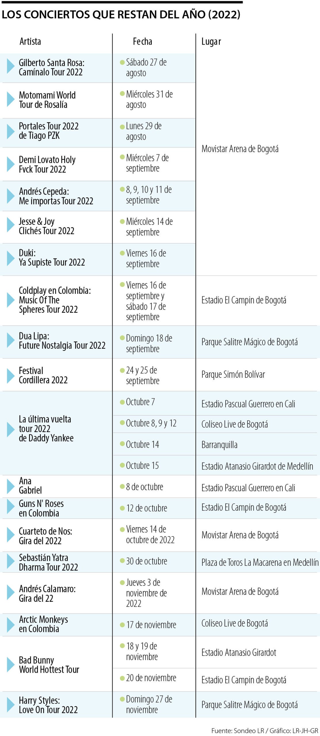 Mientras que el Parque Salitre Mágico, el Campín y el Parque Simón Bolívar recibirán el tan esperado Festival Cordillera, el Coldplay y a la cantante británica, Dua Lipa. Ante este interminable número de conciertos, Guns N' Roses, Cuarteto de Nos, Andrés Calamaro, Bad Bunny y Harry Styles ya reservaron su puesto para presentarse en estos escenarios de la capital.