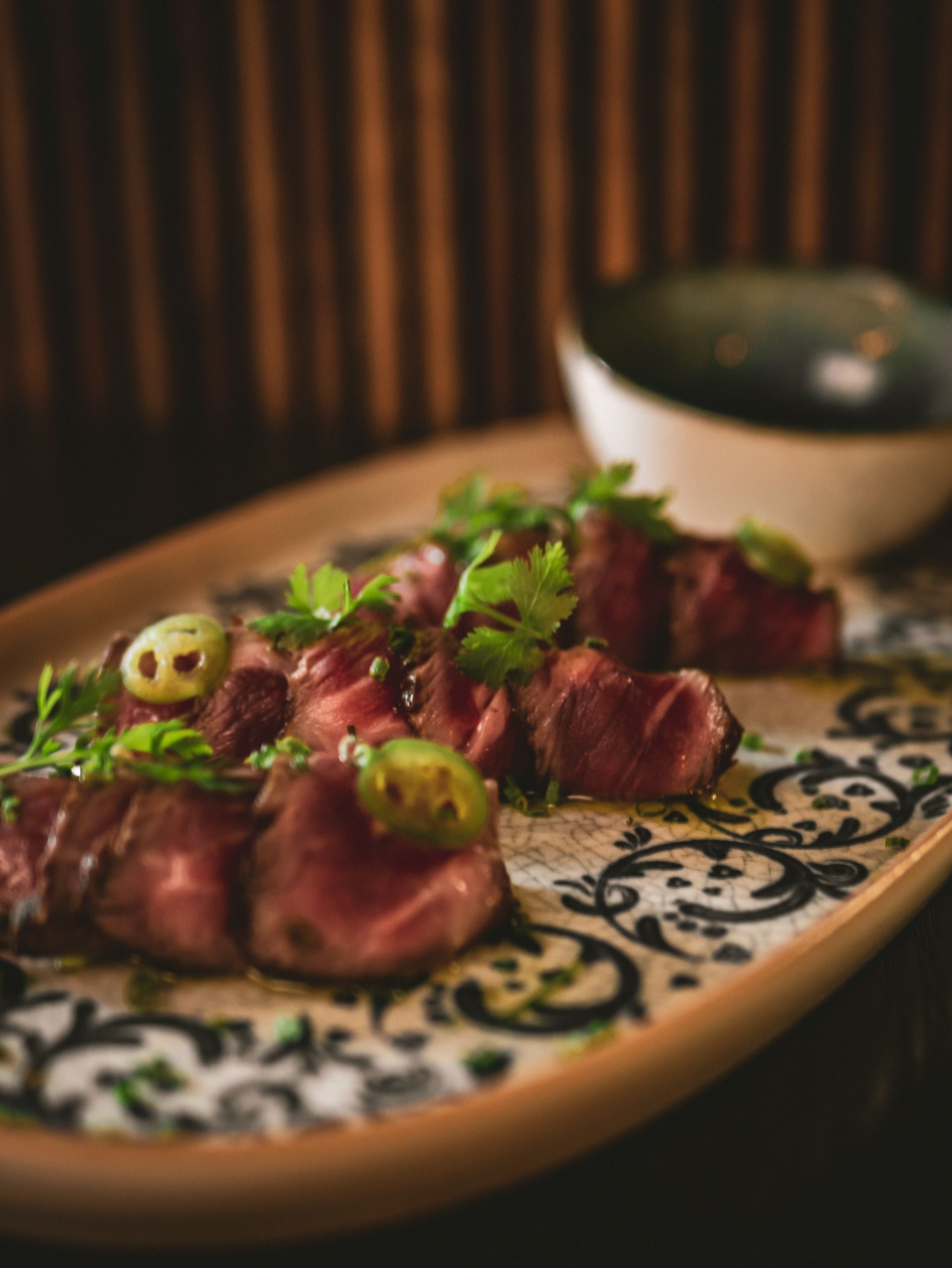 La cocina está compuesta por Pedro, Chef Ejecutivo, y Pablo, Partner Chef, quienes han recomendado una serie de platos para vivir la experiencia desde el ambiente al plato; el Tataki de picanha, Ceviche de pesca blanca, los Dim sum de hongoshitake, los Tacos de pulpo a la robata y el Lomo con bermesa.