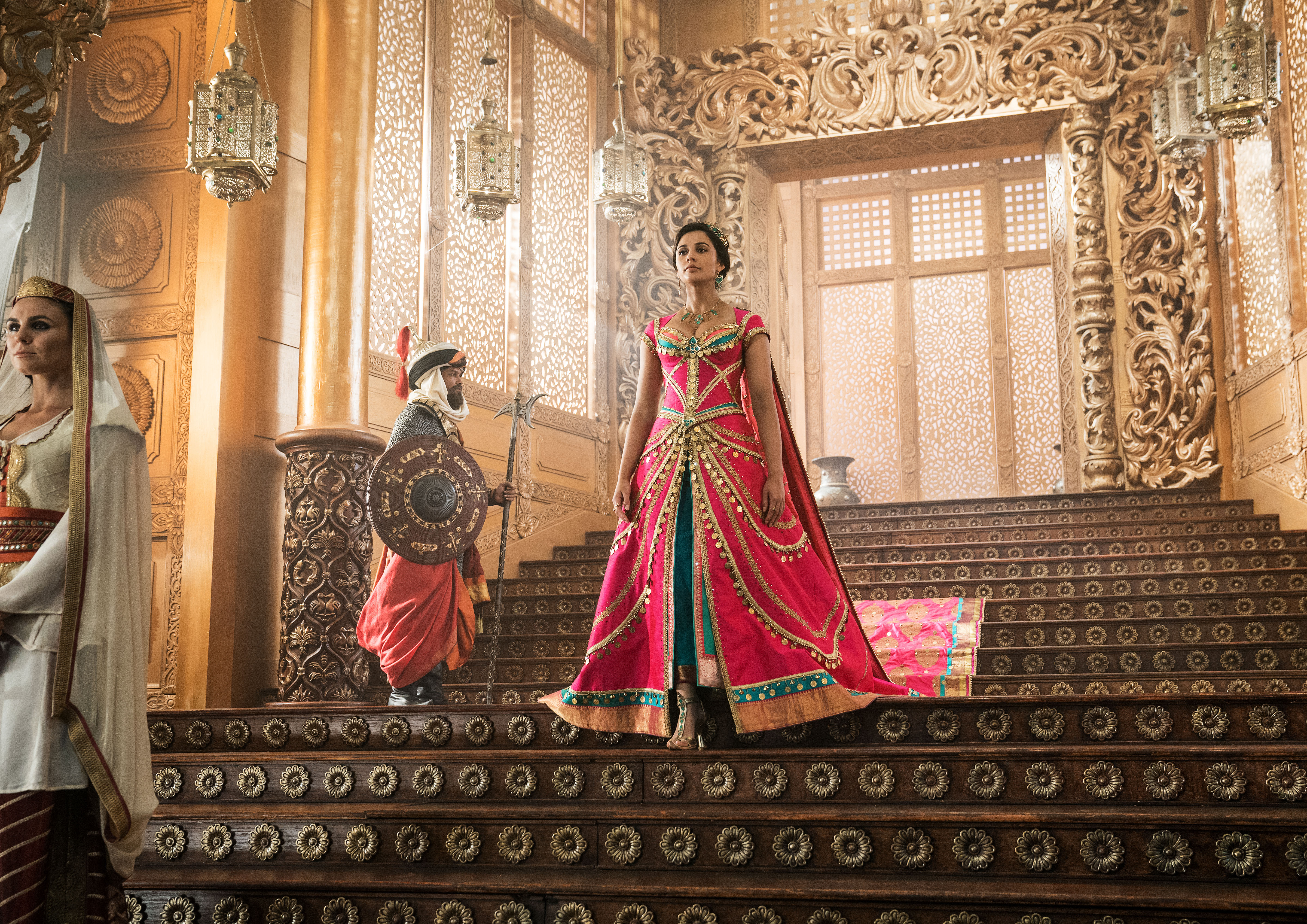 La secuencia musical “Prince Ali” (“Príncipe Alí”) es la producción más grande en la película, con 250 bailarines y 200 extras. El diseñador de vestuario, Michael Wilkinson, y su equipo crearon más de 200 atuendos sólo para los extras.