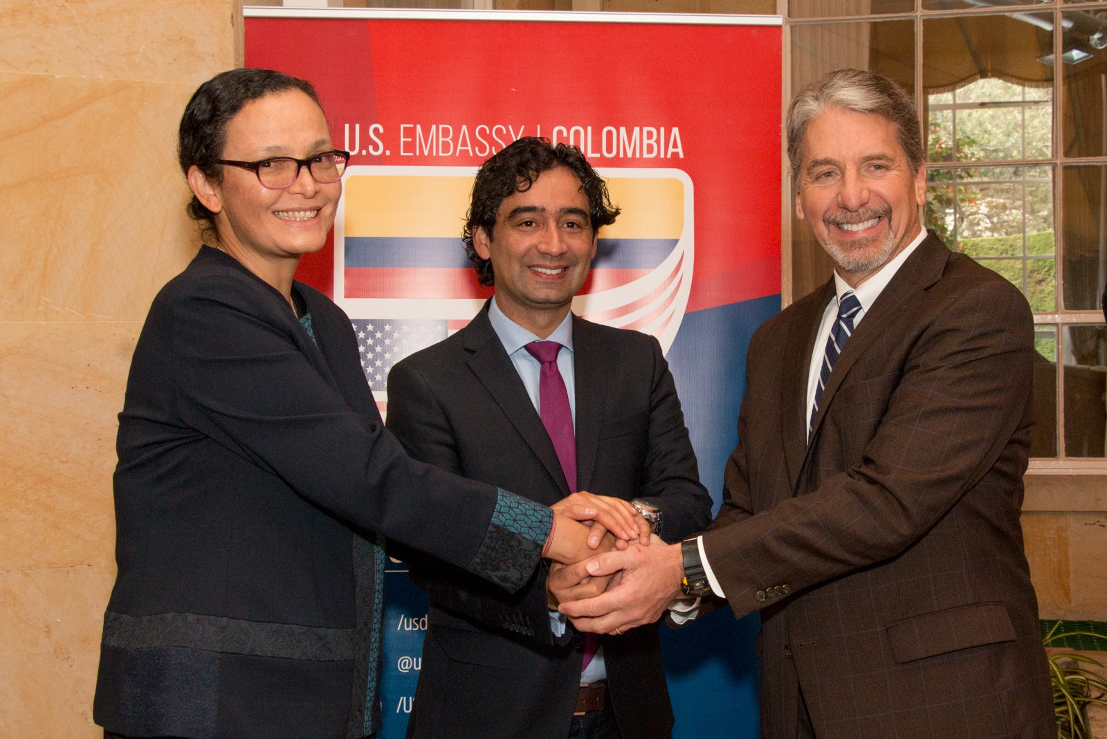 Natalia Ruíz, viceministra de Educación Nacional; Víctor Alejandro Venegas, director del Icetex; y Kevin Whitaker, embajador de los Estados Unidos en Colombia.