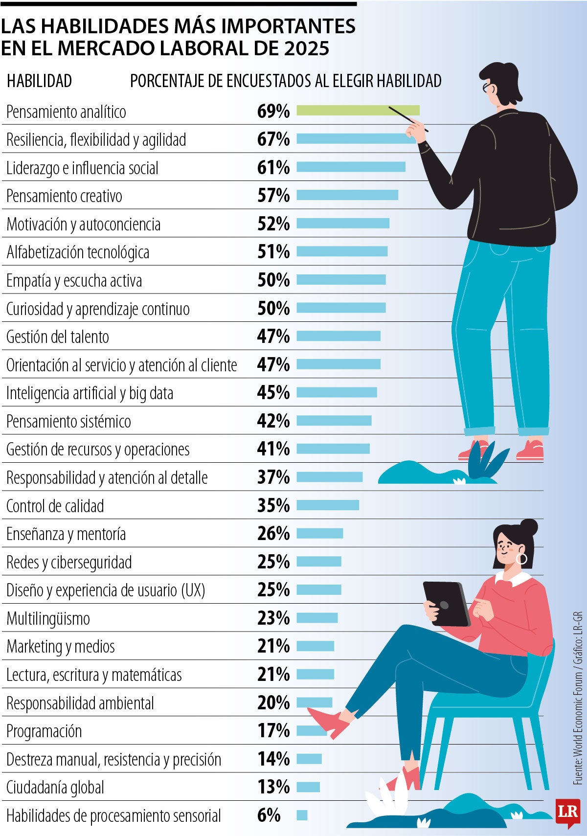Un estudio del Foro Económico Mundial identificó las habilidades más importantes para el mercado laboral de 2025, a partir de una encuesta realizada a más de 1.000 personas de empresas de todo el mundo. Entre las más valoradas se destacan el pensamiento analítico, la resiliencia, la flexibilidad, la agilidad, el liderazgo y la influencia social.