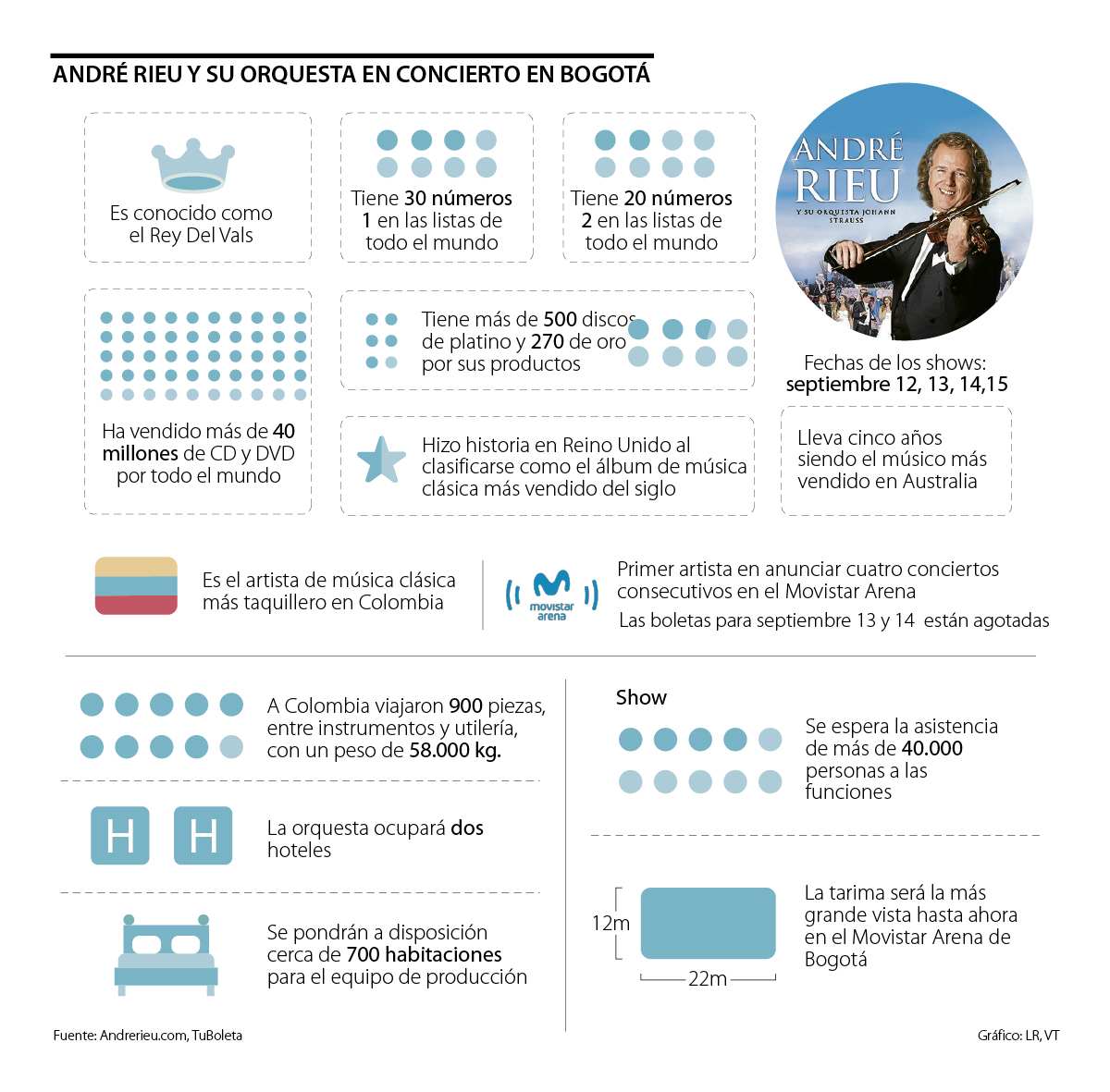De hecho, para poder recibir a los artistas en Colombia fue necesario tramitar 139 visas, entre las que se incluyen los artistas, el equipo de producción y un chef exclusivo traído desde Holanda, que hace parte de la nómina de André Rieu, y que lo acompaña en sus shows alrededor del mundo.