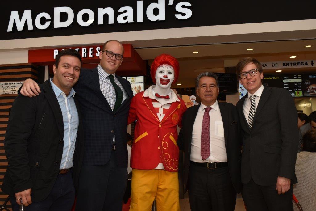 En las instalaciones del centro comercial Gran Plaza se llevó a cabo el evento oficial de apertura del primer restaurante de la cadena de comida rápida McDonald’s en el municipio de Soacha. Al evento asistieron los principales representantes y directivos de la marca. En la foto: Héctor Orozco, director de operaciones; Francisco Staton, director general Arcos Dorados Colombia; Ronald McDonald; Eleazar González Casas, alcalde del municipio de Soacha; y Andrés Gómez, jefe de Desarrollo.