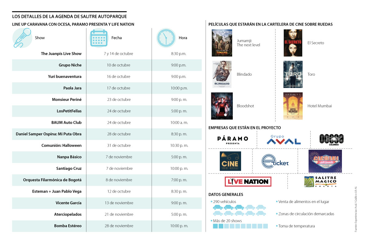 En el caso puntual de los conciertos serán más de 20 shows de grandes artistas latinoamericanos y de diferentes ritmos y géneros los que se podrán disfrutar inicialmente entre el 7 de octubre al 28 de noviembre de 2020 en Salitre Auto Parque. Entre los artistas que participan están Grupo Niche, Yuri buenaventura, Paola Jara, Monsieur Periné, LosPetitFellas, Santiago Cruz, Vicente García, Aterciopelados y Bomba Estéreo. Sin embargo, se espera que se sumen más en el resto de los meses de 2020.