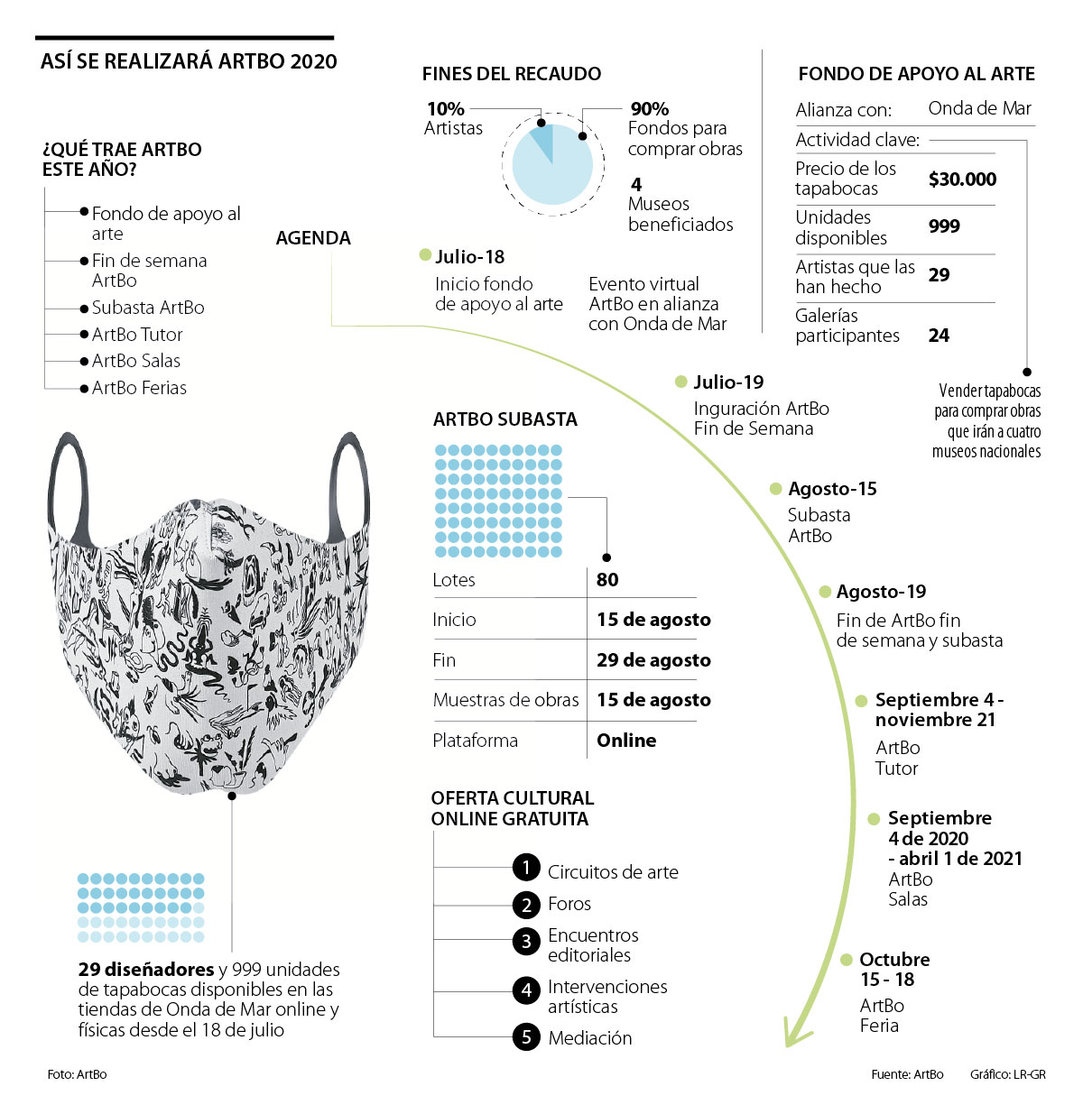 De la alianza para el fondo de apoyo al arte se esperan vender 999 tapabocas diseñados por 29 artistas de diferentes galerías a $30.000. Del total de las ventas de estos tapabocas, 10% irá para los artistas participantes y el resto se invertirá en la compra de obras artísticas para cuatro museos nacionales: Museo de Arte Moderno de Barranquilla, Museo de Arte Moderno de Medellín, Museo de Arte Moderno de Bogotá y La Tertulia.