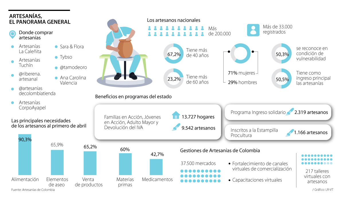 En Colombia hay más de 200.000 artesanos, según cifras de Artesanías de Colombia, que trabajan para mantener viva la tradición histórica de diferentes regiones y culturas de nuestro país. Sin embargo, este es un trabajo que representa muchos retos en términos de estabilidad financiera de quienes lo hacen y con la llegada de la crisis se han visto en duras situaciones, siendo la alimentación la mayor necesidad de este grupo con un 90,3% de importancia, seguido de elementos de aseo personal y limpieza del hogar con 65,9%, y la venta de sus productos en 65,2%.