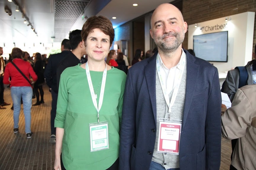 Martín Rodríguez, representante de Nómada, de Guatemala, y Patricia Torres-Burd de Media Development Investment Fund.