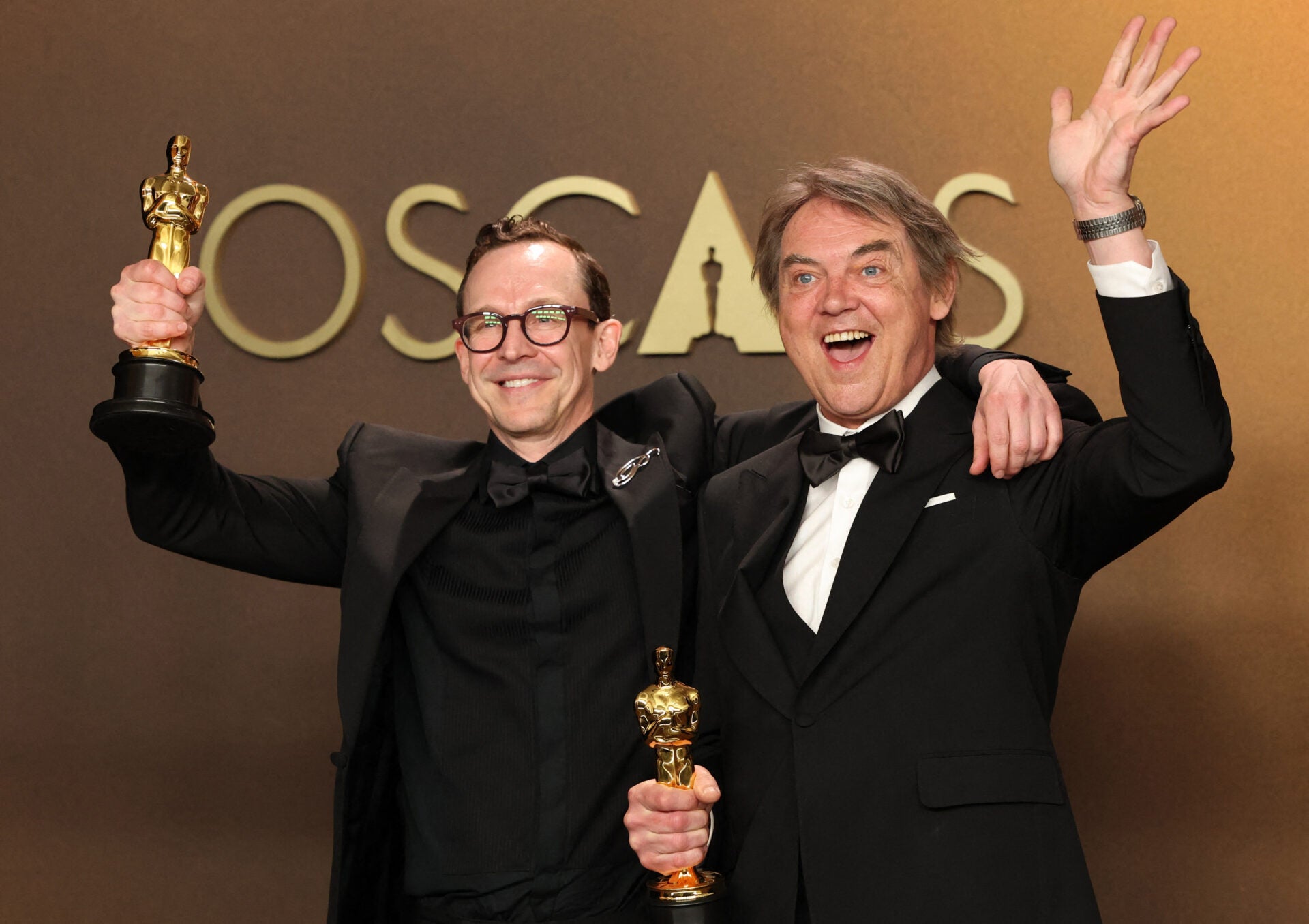 Chris Lavis y Maciek Szczerbowski posan con el Óscar al Mejor Cortometraje de Animación por ‘La chica que lloraba perlas’ en la sala de fotos durante los Premios de la Academia.
