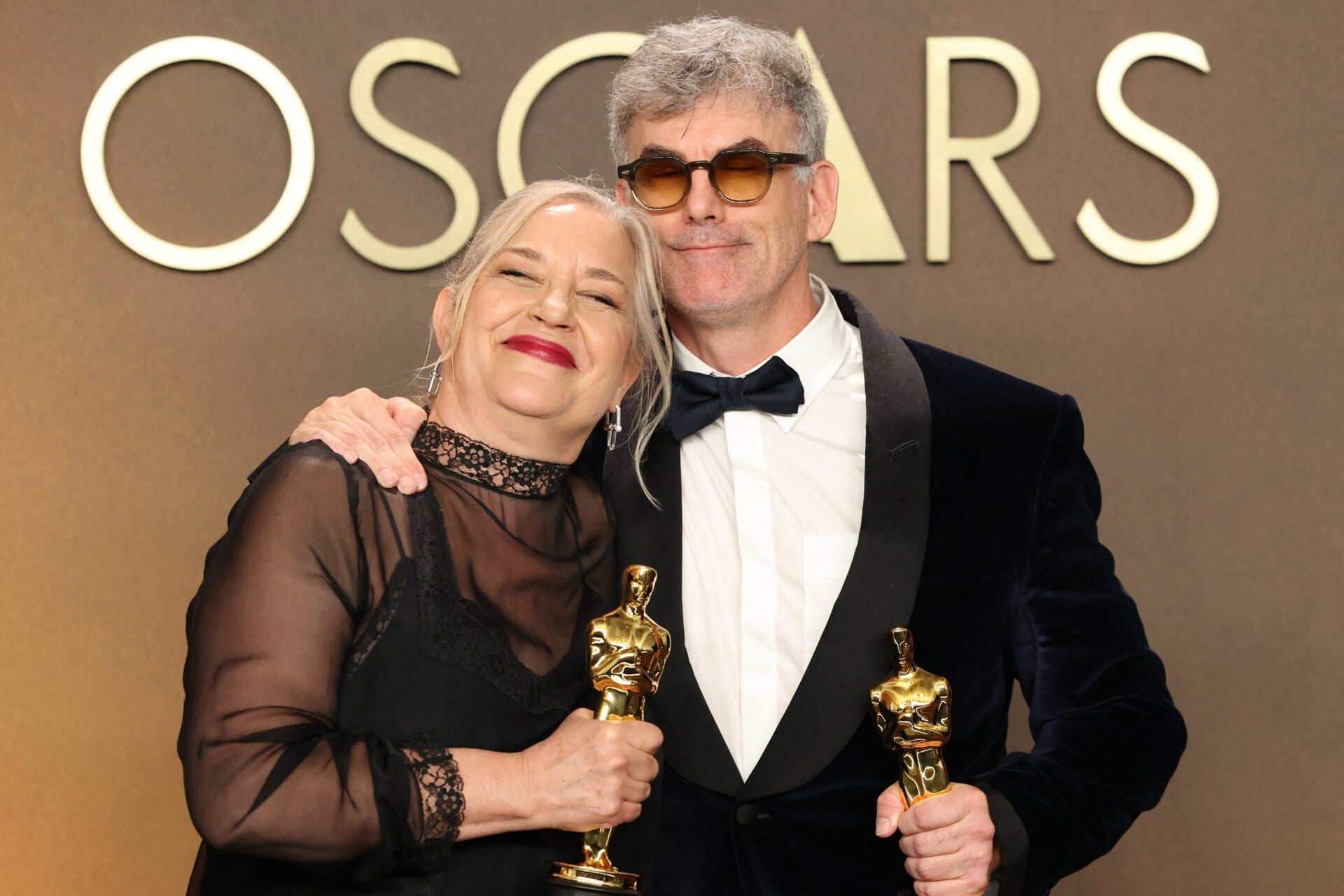 Tamara Deverell y Shane Vieau posan con el Óscar al Mejor Diseño de Producción por ‘Frankenstein’ en la sala de fotos de los Premios. Es la película de Guillermo del Toro.