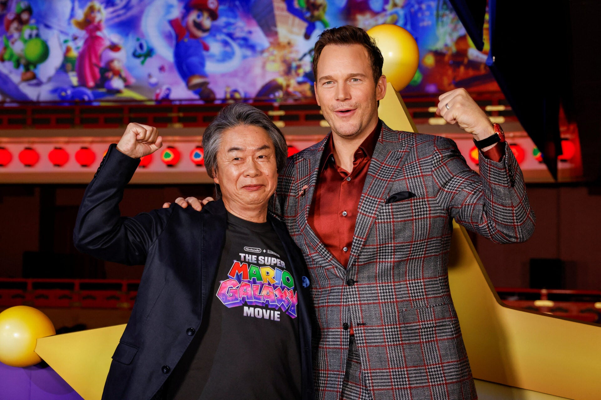 El actor Chris Pratt, quien prestó su voz para la cinta, y el productor Shigeru Miyamoto asisten al estreno mundial de la película en Kioto.
