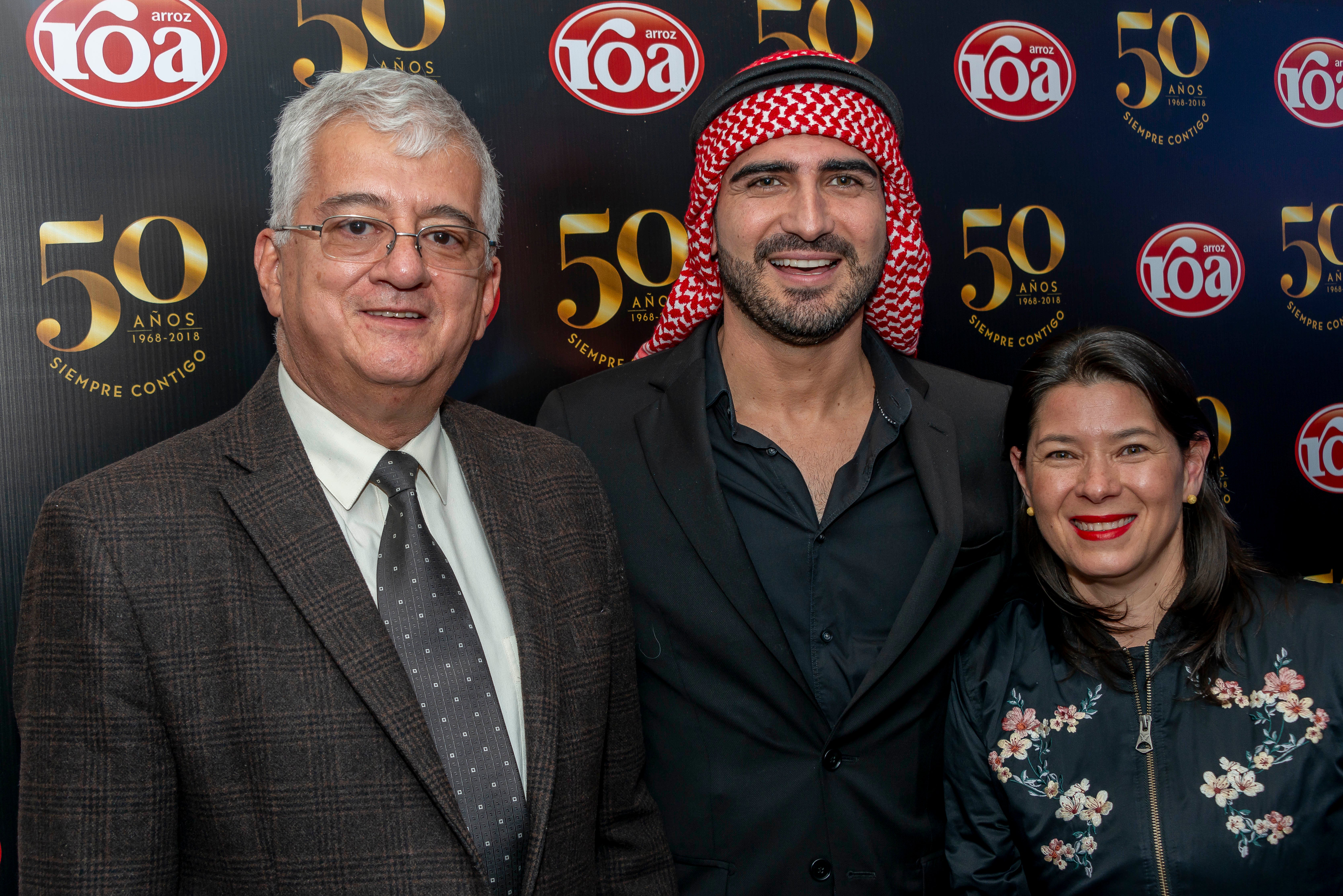 Silverio Gómez, director de Induarroz; Mustafá, ícono de la marca Arroz Roa, en compañía de Pilar Ortiz, durante la celebración.