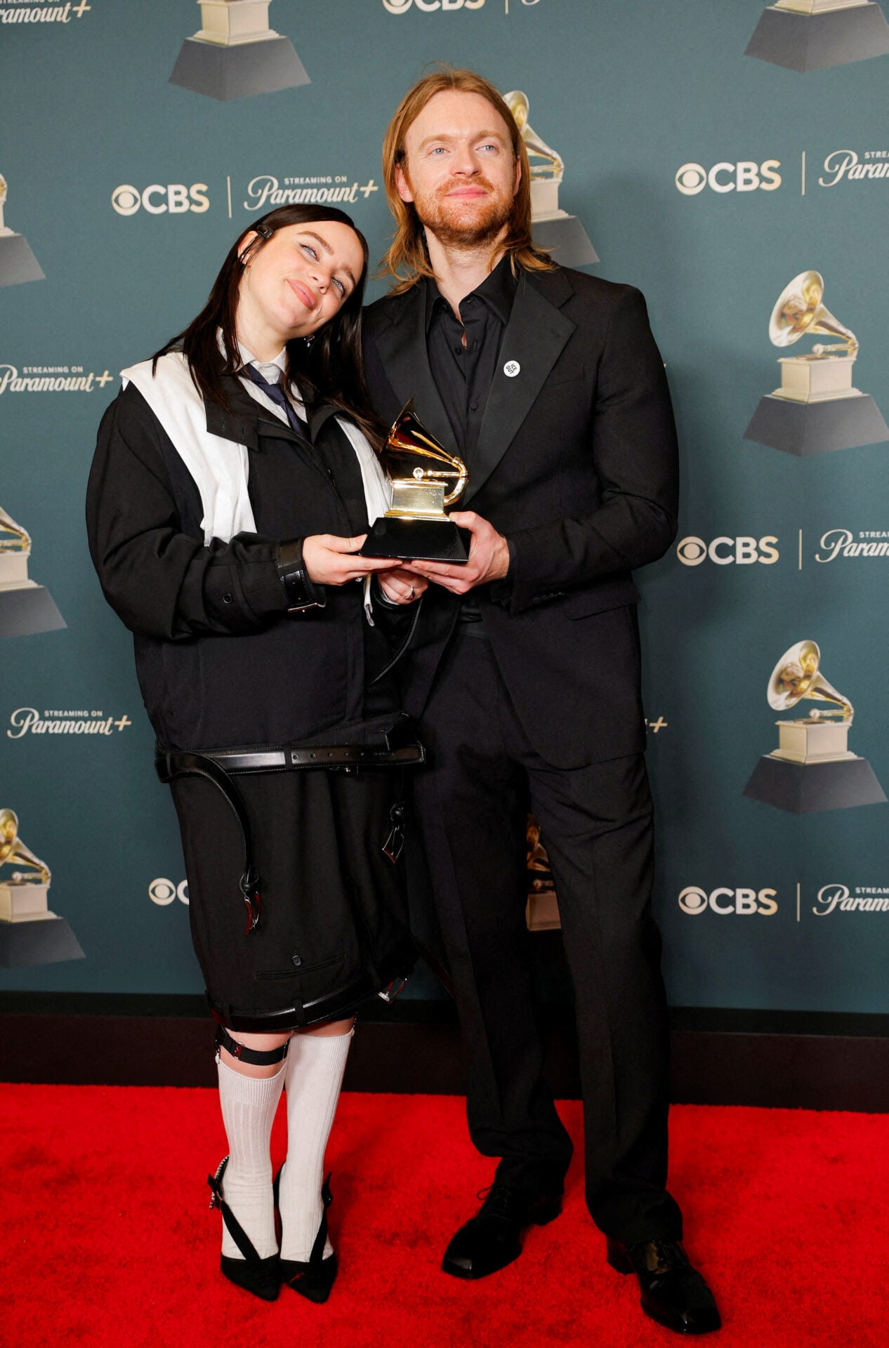 La cantante Billie Eilish y su hermano, Finneas, posan con el premio a la Canción del Año.