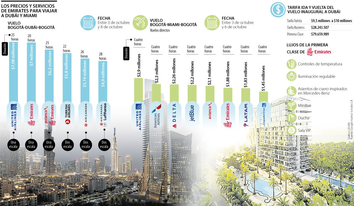 Si bien la ruta oficial que operará la aerolínea de lujo Emirates será la de Bogotá-Dubái, esta lo hará con una escala en Miami, destino a donde también venderán tiquetes. Lo hará con servicios premium en primera clase y en ejecutiva.
