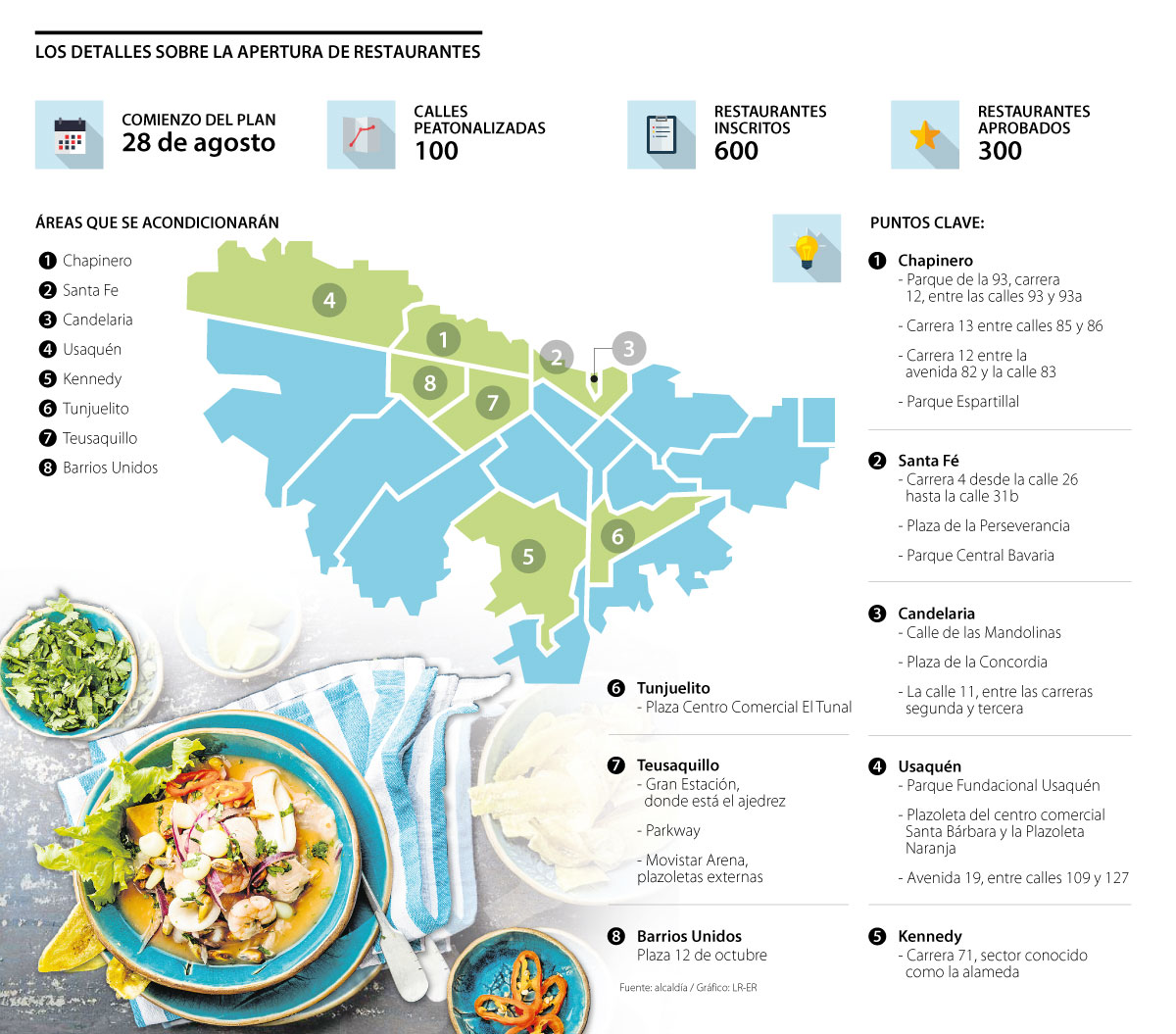Actualmente en el proyecto están involucradas ocho zonas de la capital: Chapinero, Santa Fe, La Candelaria, Usaquén, Kennedy, Tunjuelito, Teusaquillo y Barrios Unidos. De estas son 100 las calles que se van a peatonalizar para iniciar el proyecto en el que ya hay más de 600 restaurantes inscritos para la selección, de los cuales 300 ya han sido seleccionados de manera definitiva para dar inicio al plan piloto.