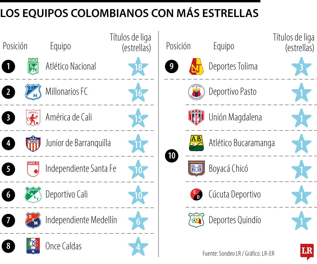 En el segundo lugar aparece Millonarios, con 16 estrellas, seguido por América de Cali, que acumula 15 campeonatos, ambos con un peso histórico determinante desde los inicios del profesionalismo en Colombia.