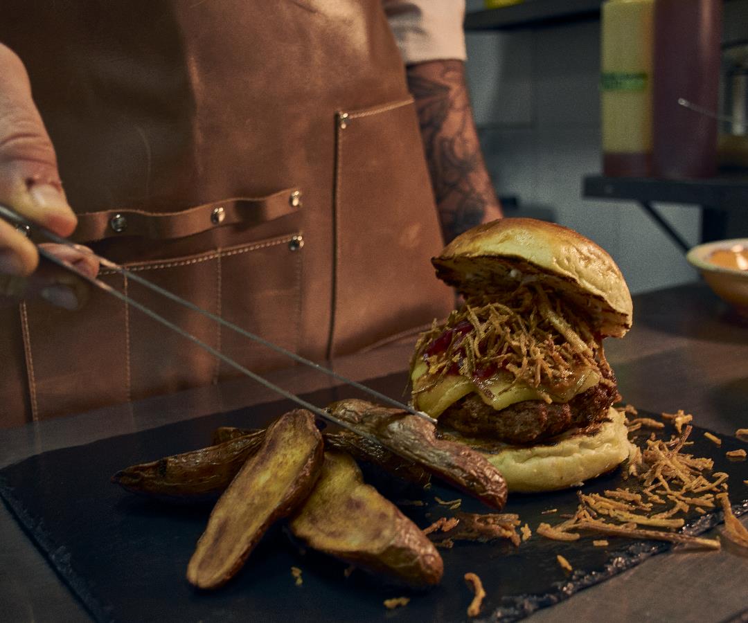 Las hamburguesas de Balú son hechas con un pan suave y esponjoso, las salsas son a base de productos muy campesinos, incluye cebolla puerro y encurtida y está acompañada de cascos de papa nativa.