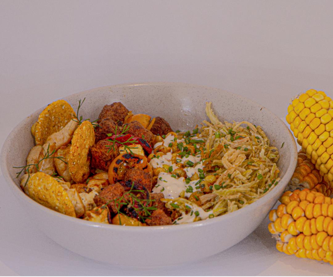 Este plato que puede disfrutar a domicilio tiene mazorca desgranada salteada, queso campesino asado, puerro frito, tomates cherry, cubos de plátano maduro y mayonesa de la casa.