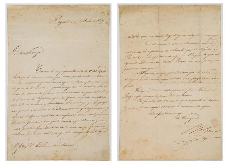 De acuerdo con Timothée de Saint Albin, cofundador y director del departamento de libros e impresos de Bogotá Auctions “entre las piezas centrales de esta subasta se encuentra una excepcional carta manuscrita de Simón Bolívar, fechada en 1827 en Bogotá, revelando sus pensamientos íntimos sobre la carga de su papel como jefe de Estado”. Otro tesoro, “la obra poco conocida de José Celestino Mutis sobre la quinina (Madrid, 1828), así como una obra rara sobre la religiosa de Bogotá, sor María Gertrudis Theresa de Santa Inés, publicada en Madrid en 1752”.