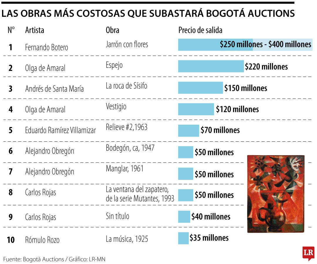 Las otras piezas de grandes artistas y que están entre los precios de salida más altos son las de Andrés de Santa María, ‘La roca de Sísifo’ ($150 millones); Eduardo Ramírez Villamizar, ‘Relieve #2,1963’ ($70 millones); la de Alejandro Obregón, ‘Bodegón’ y ‘Manglar’ ($50 millones); Carlos Rojas, ‘La ventana del zapatero, de la serie Mutantes, 1993’ ($50 millones); y la de Rómulo Rozo, ‘La música, 1925’ ($35 millones). Esta última obra fue realizada en París en 1925. “Este trabajo es de una belleza conmovedora y guarda importantes relaciones formales con la célebre ‘Bachué’, que el artista talló en ese mismo 1925 y que, hoy en día, se ha consolidado como uno de los mayores hitos del arte colombiano del siglo XX”, expresó el director del departamento de arte.